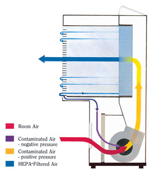 在一個(gè)水平層流潔凈工作臺(tái),室內(nèi)空氣通過(guò)送風(fēng)機(jī)/電動(dòng)機(jī)吸入到機(jī)罩的基礎(chǔ)上,通過(guò)一可清洗,可重復(fù)使用的預(yù)過(guò)濾器。引擎蓋通過(guò)HEPA過(guò)濾器的空氣推高后全會(huì)。過(guò)濾的空氣在100 FPM朝向用戶的等速橫過(guò)工作表面水平地定向。